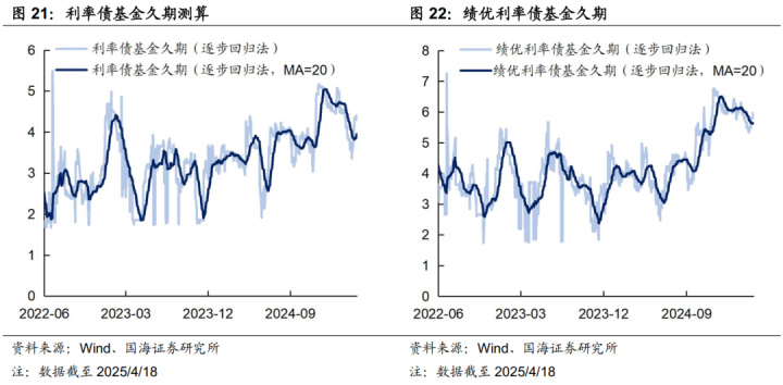 本周市场绩优利率债基金和一般利率债基金久期测算值分别为5.65和3.95,较上周分别增加0.02和0.11。