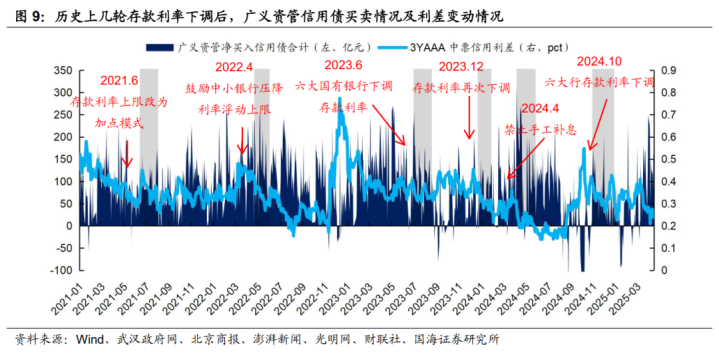 另一方面,信用债的机会相对更具确定性。参考过往几轮存款利率下调,广义资管对信用债,尤其是1-3Y的品种需求增加,往往导致3Y信用债利差收窄。